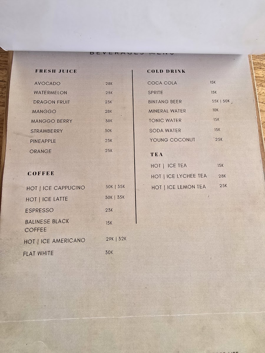 - Hot and cold beverages: coffee varieties, fresh juices, and iced teas.